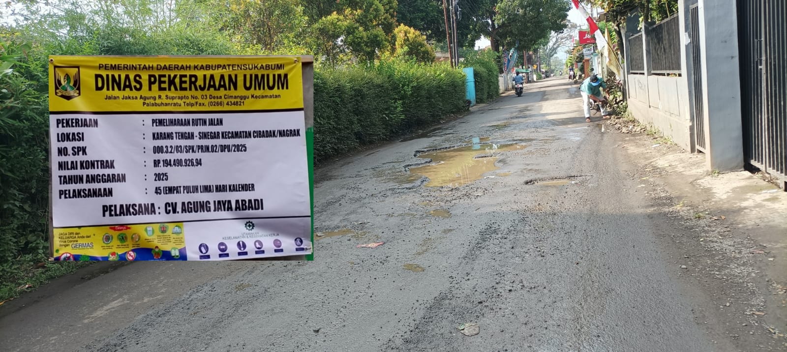 Berdasarkan dokumen yang dihimpun, pekerjaan pemeliharaan rutin jalan tersebut dilaksanakan oleh CV. Agung Jaya Abadi dengan kontrak bernomor 000.3.2/03/SPK/PRJN.02/DPU/2025 senilai Rp194.490.926,94. Proyek ini berada di bawah tanggung jawab Dinas Pekerjaan Umum Kabupaten Sukabumi dengan jangka pelaksanaan 45 hari kalender.