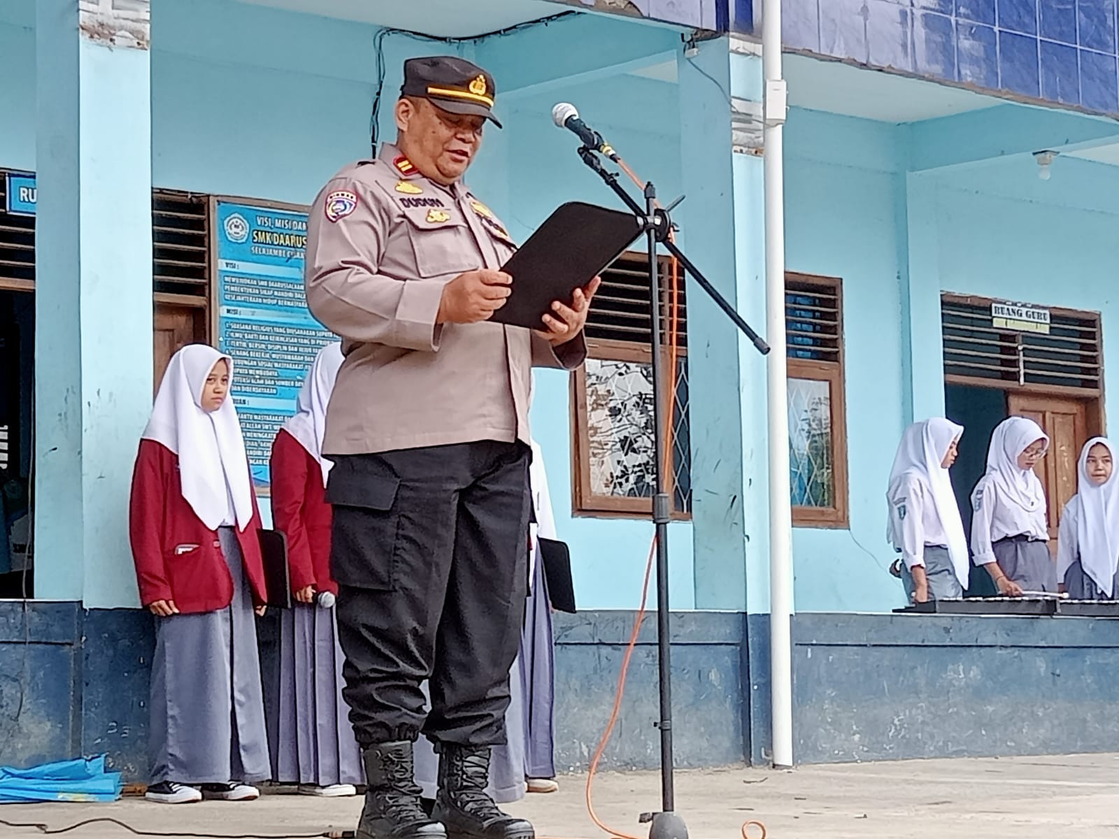 Cisaat – Panit Binmas Polsek Cisaat Polres Sukabumi Kota Iptu Duduh Abdurahman menjadi pembina upacara bendera di SMK Darussalam Desa Selajambe Kecamatan Cisaat Kabupaten Sukabumi.Senin (20/2/2023).Pagi