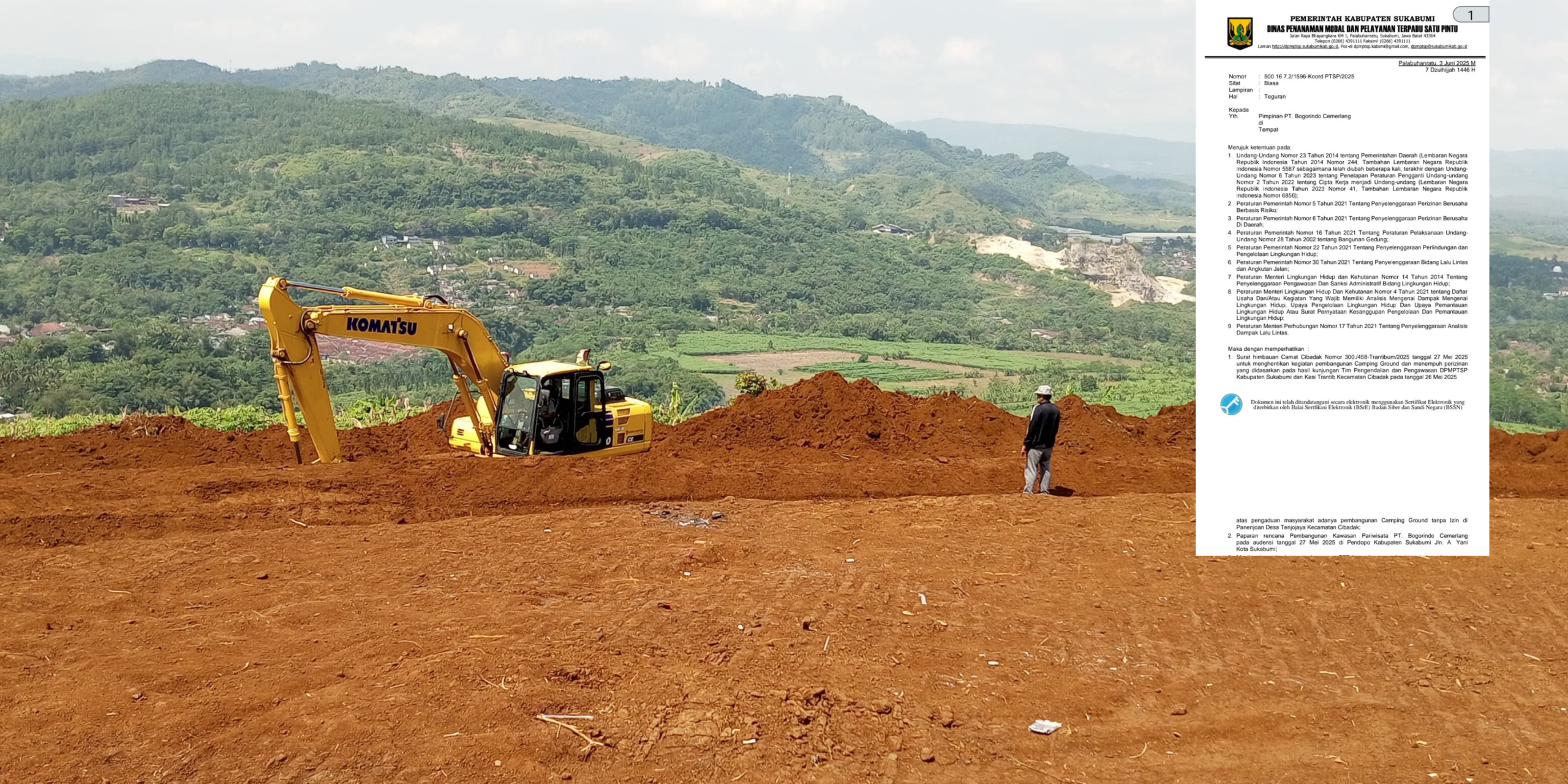 Berdasarkan pantauan media di lapangan, alat berat masih beroperasi dan kegiatan cut and fill terus berjalan. Padahal, Dinas Penanaman Modal dan Pelayanan Terpadu Satu Pintu (DPMPTSP) Kabupaten Sukabumi telah mengeluarkan surat teguran bernomor 500.16.7.2/1596-Koord.PTSP/2025. Surat tersebut berisi perintah penghentian sementara kegiatan proyek hingga seluruh dokumen perizinan dipenuhi.