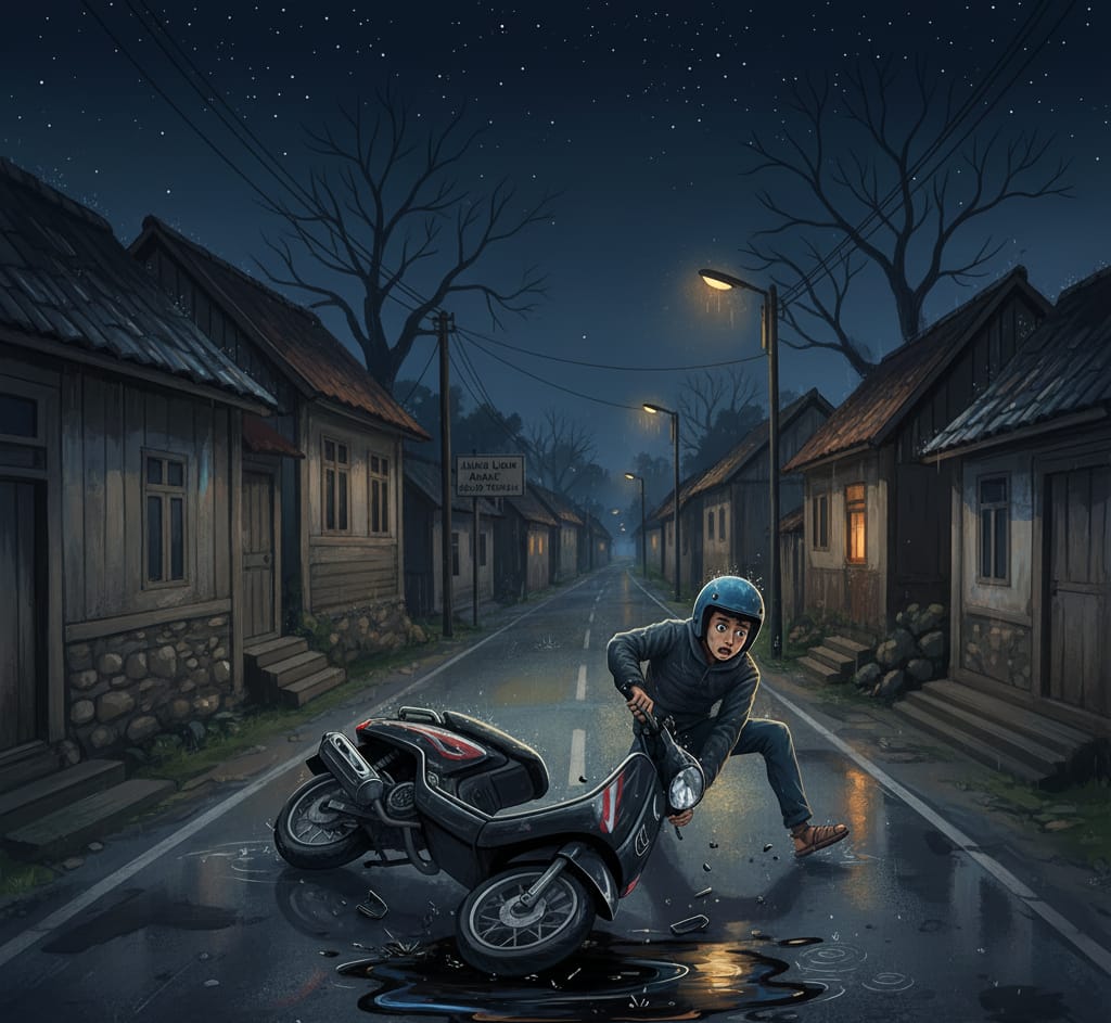 Sukabumi, Lingkarjabar– Kecelakaan tunggal terjadi di Jalan Kadupugur–Cijengkol, tepatnya di Kampung Cisande Hilir, Desa Cijalingan, Kecamatan Cicantayan, pada Senin malam (17/11/2025) sekitar pukul 22.30 WIB. Insiden ini diduga disebabkan oleh tumpahan Bahan Bakar Minyak (BBM) jenis solar yang membuat permukaan jalan sangat licin, ditambah kondisi minim penerangan di area tersebut.